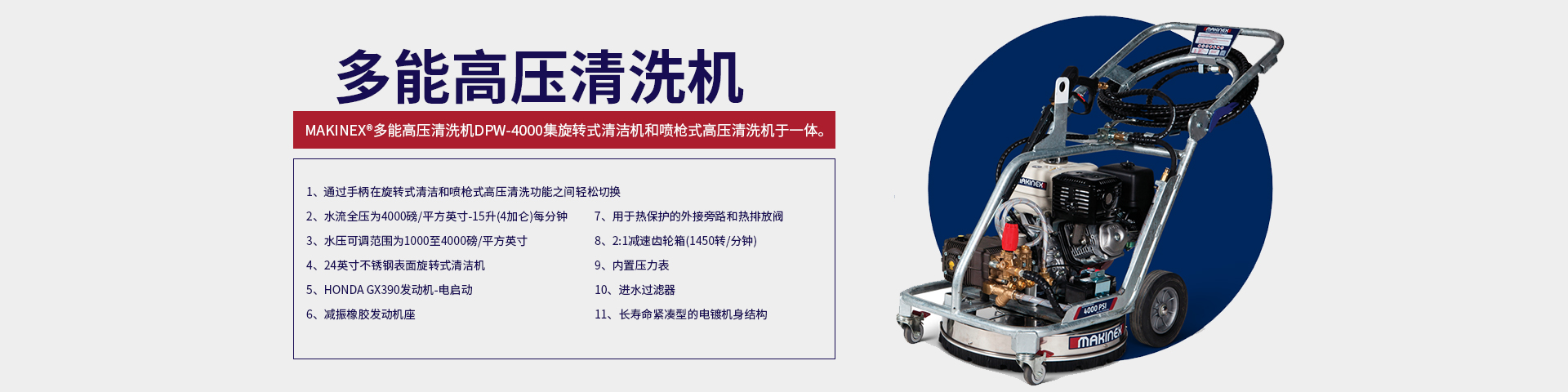 Makinex多能高壓清洗機DPW-4000具有無可比擬的多用性。雙清洗機功能和可調節(jié)的水壓使其完美適用于重型外部清潔應用…
